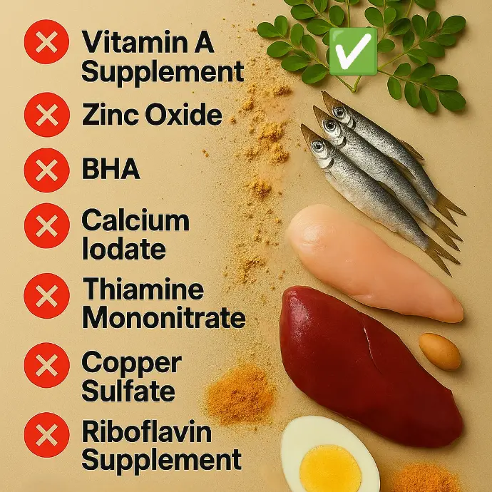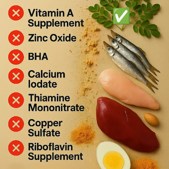 - Real chicken, liver, heart, anchovies, moringa, egg yolk